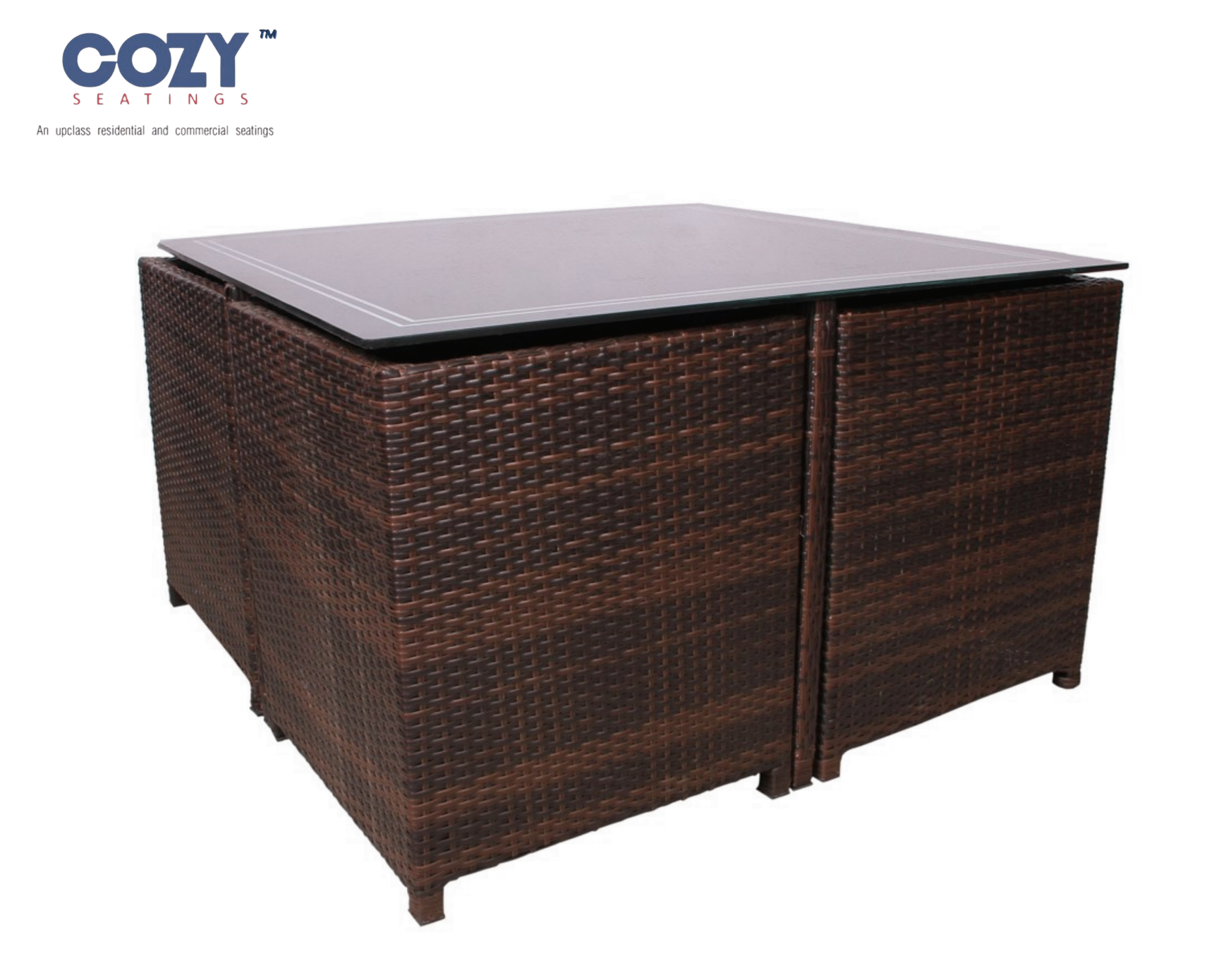 Maximise your outdoor space with the Cozy Seatings 5-Piece Cube Wicker Dining Set. This highly functional set is designed for clever, space-saving storage and is an ideal choice for “upclass residential and commercial seatings”.