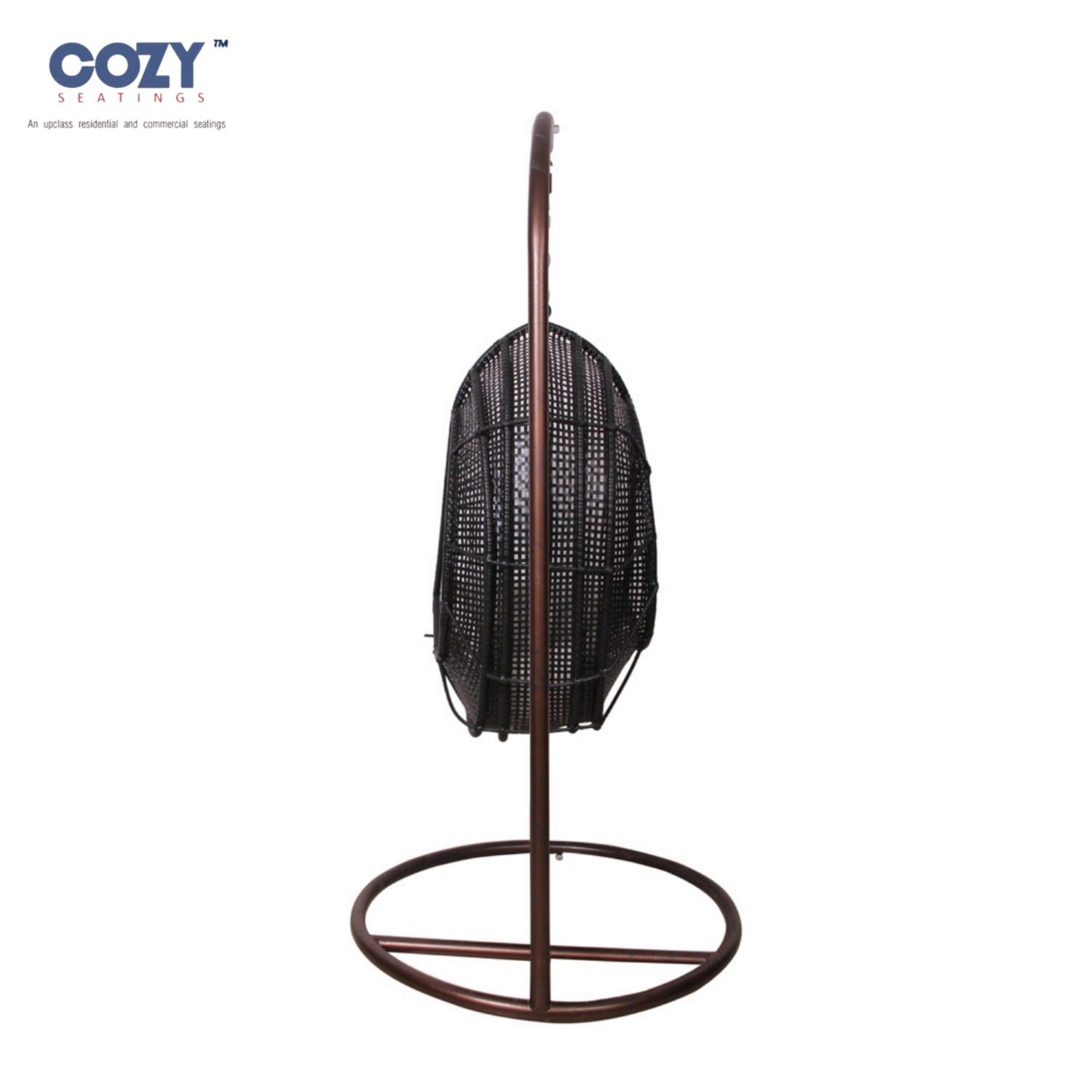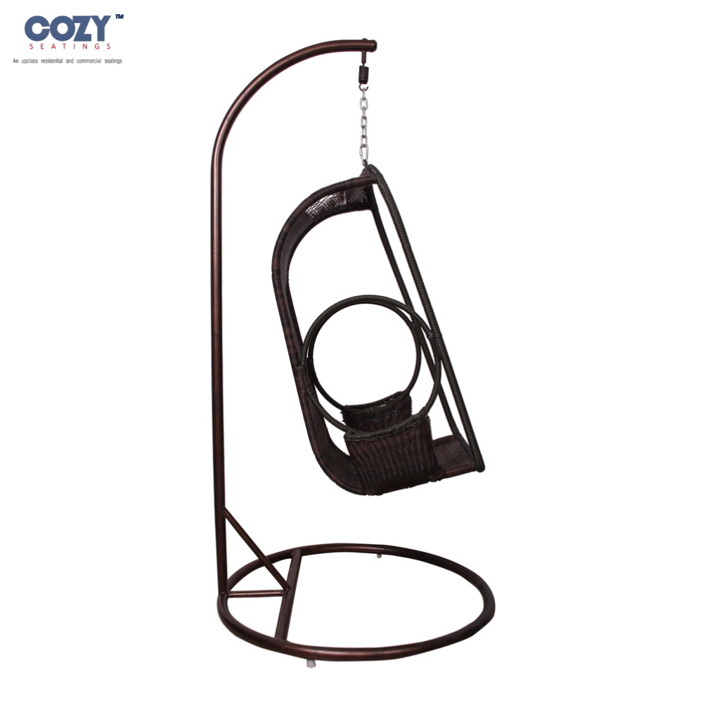 • Freestanding Design: The chair is securely suspended from a curved metal stand.
