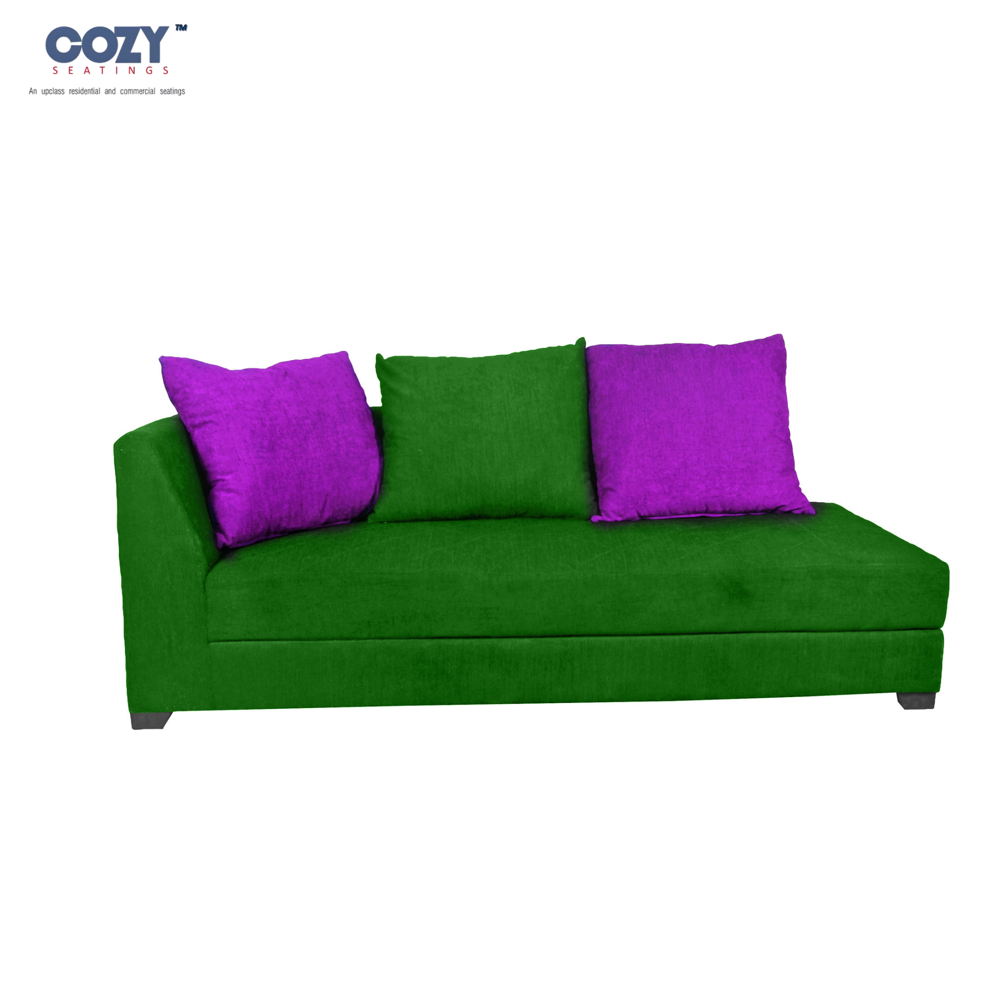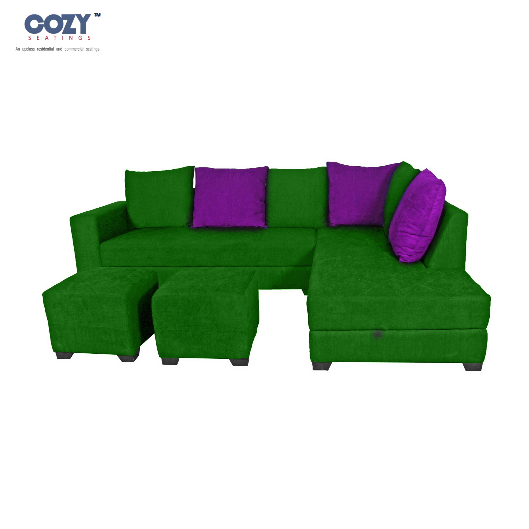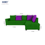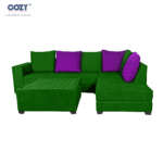 Bring a fresh and vibrant look to your living room with this stylish L-shaped sofa from Cozy Seatings. Upholstered in rich green fabric and beautifully accented with bold purple cushions, this sofa creates a striking contemporary appeal. The spacious seating arrangement along with the matching ottoman provides superior comfort for relaxing or entertaining guests. Crafted with plush cushioning and a strong, durable frame, it ensures long-lasting support and reliability. Perfect for modern homes, lounges, and entertainment areas, this sectional sofa blends elegance, comfort, and functionality effortlessly.