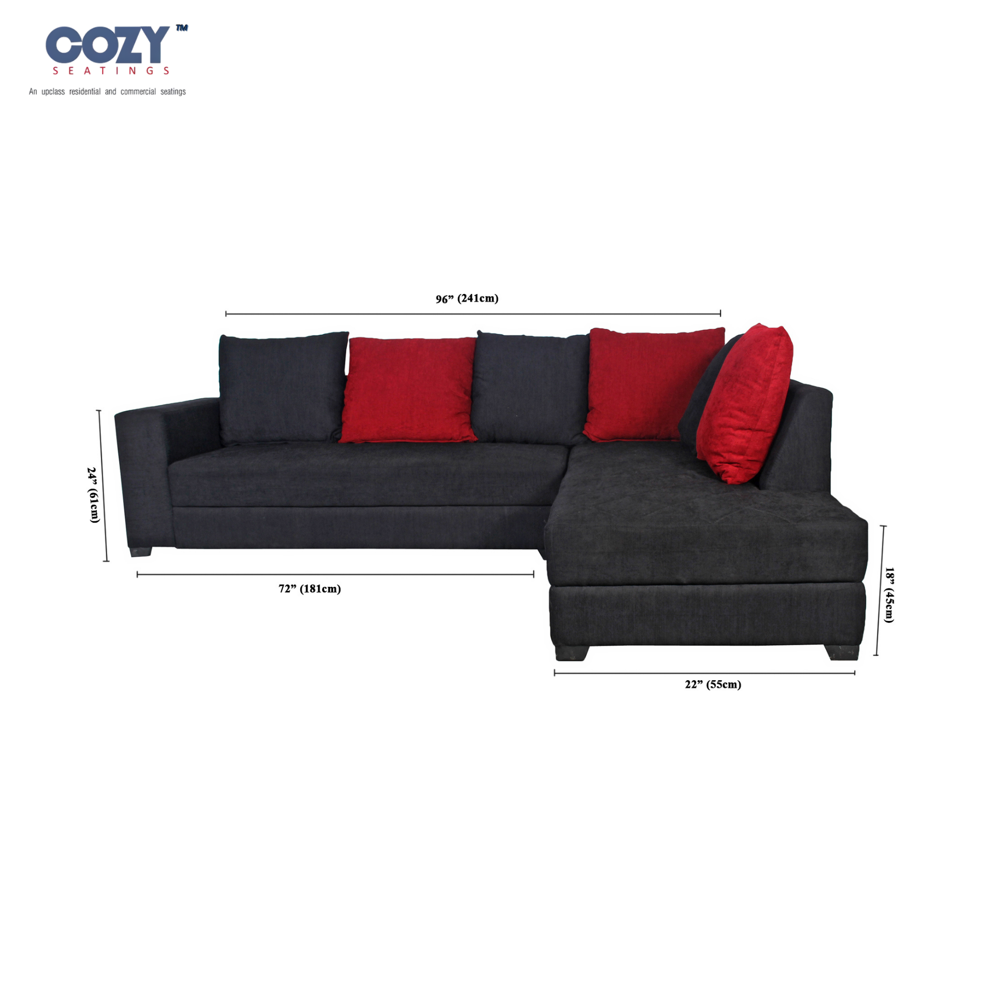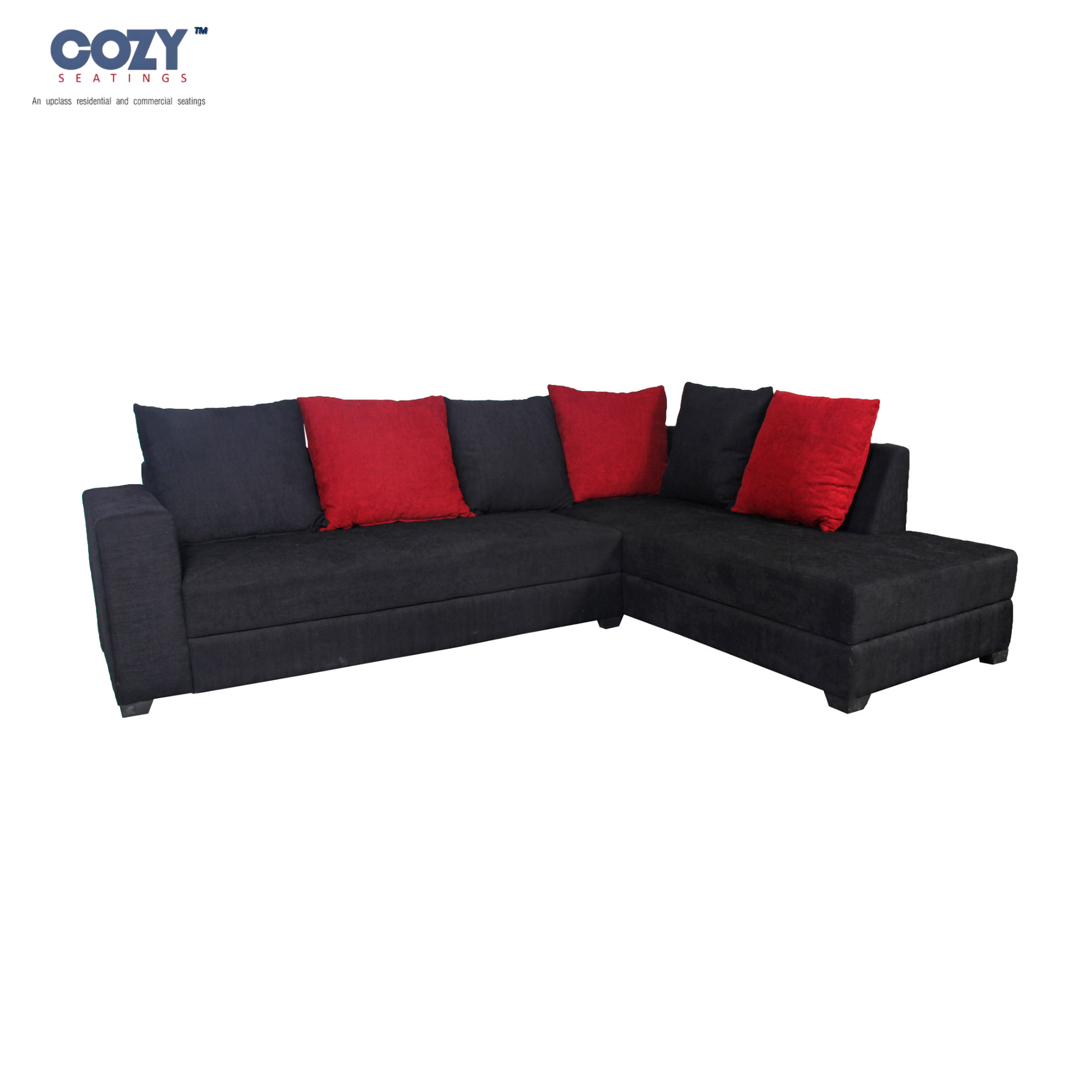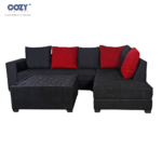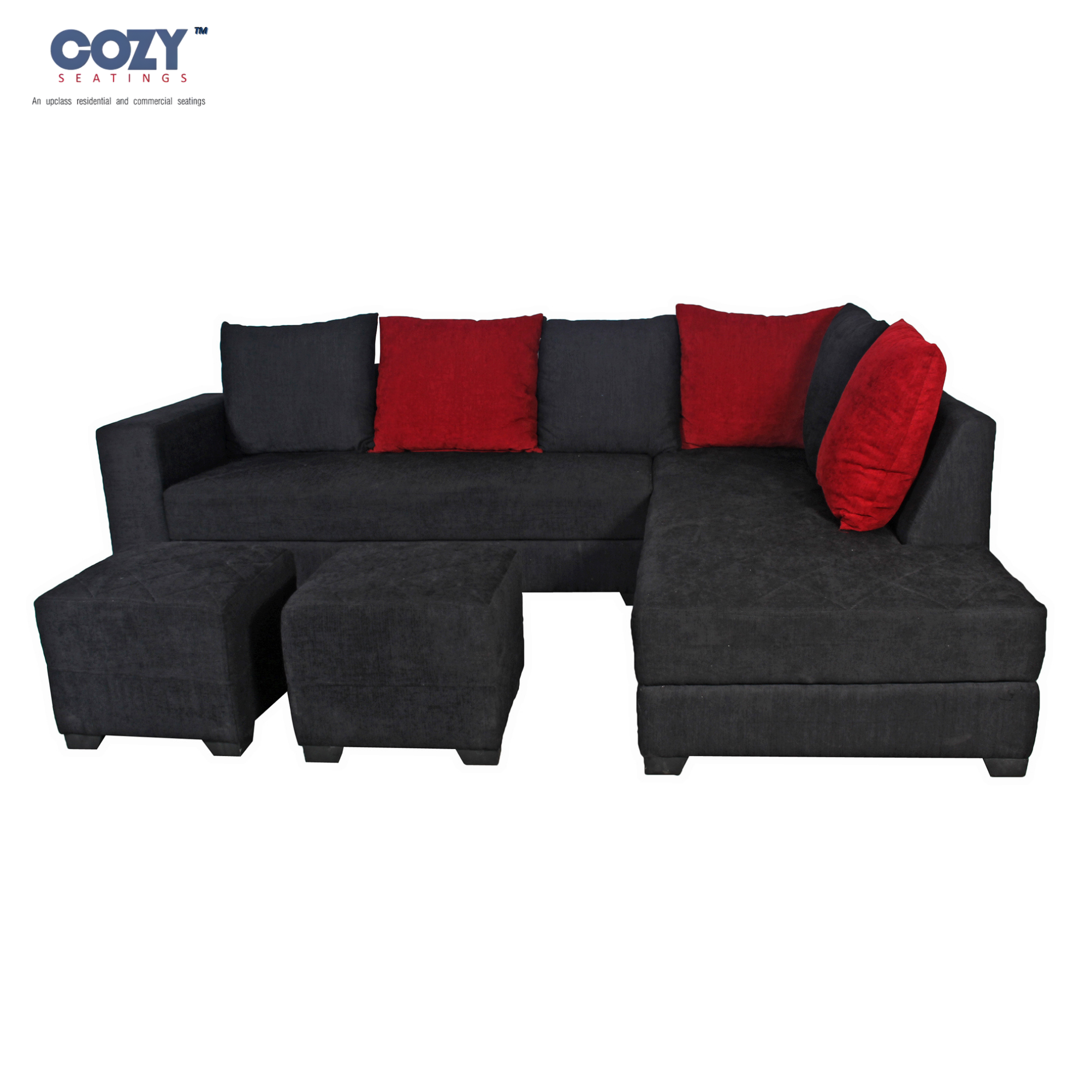 Upgrade your living room with this premium L-shaped sofa set from Cozy Seatings, designed for modern comfort and bold style. Upholstered in rich charcoal black fabric and highlighted with striking red cushions, this sofa brings a contemporary and elegant look to your space. The spacious seating arrangement with a matching ottoman offers ultimate relaxation for family and guests. Built with a strong, durable frame and plush cushioning, it ensures long-lasting comfort and support. Perfect for large living rooms, entertainment areas, or lounges, this sectional sofa adds sophistication and functionality to your home décor.