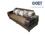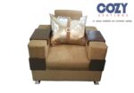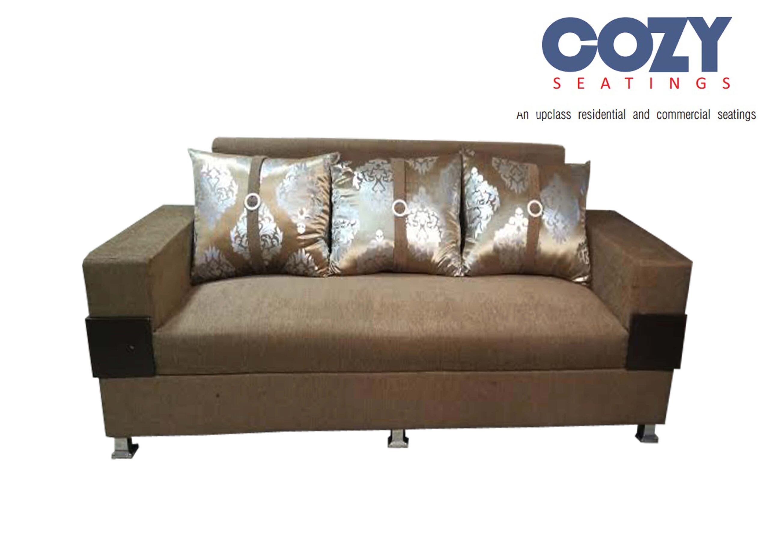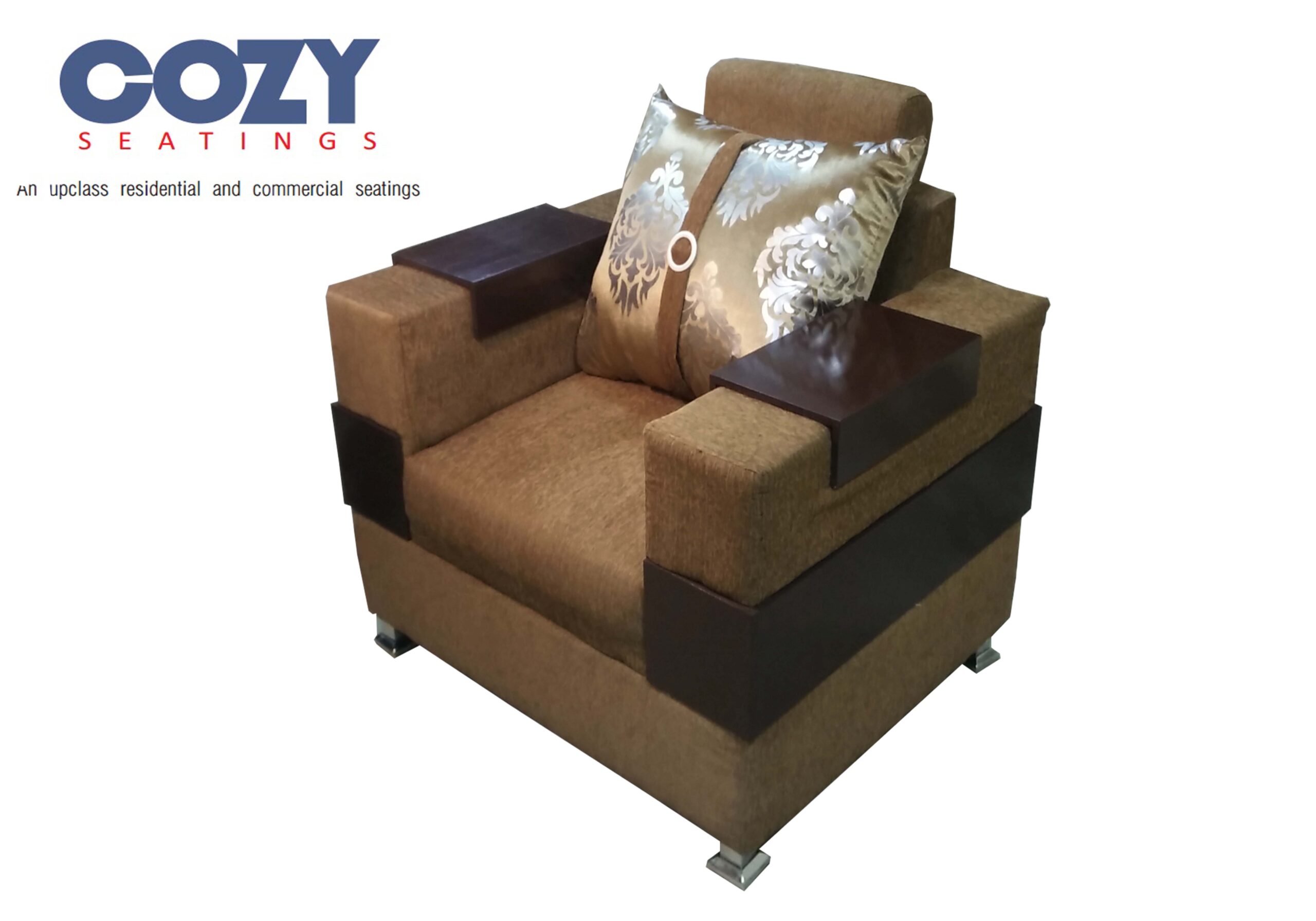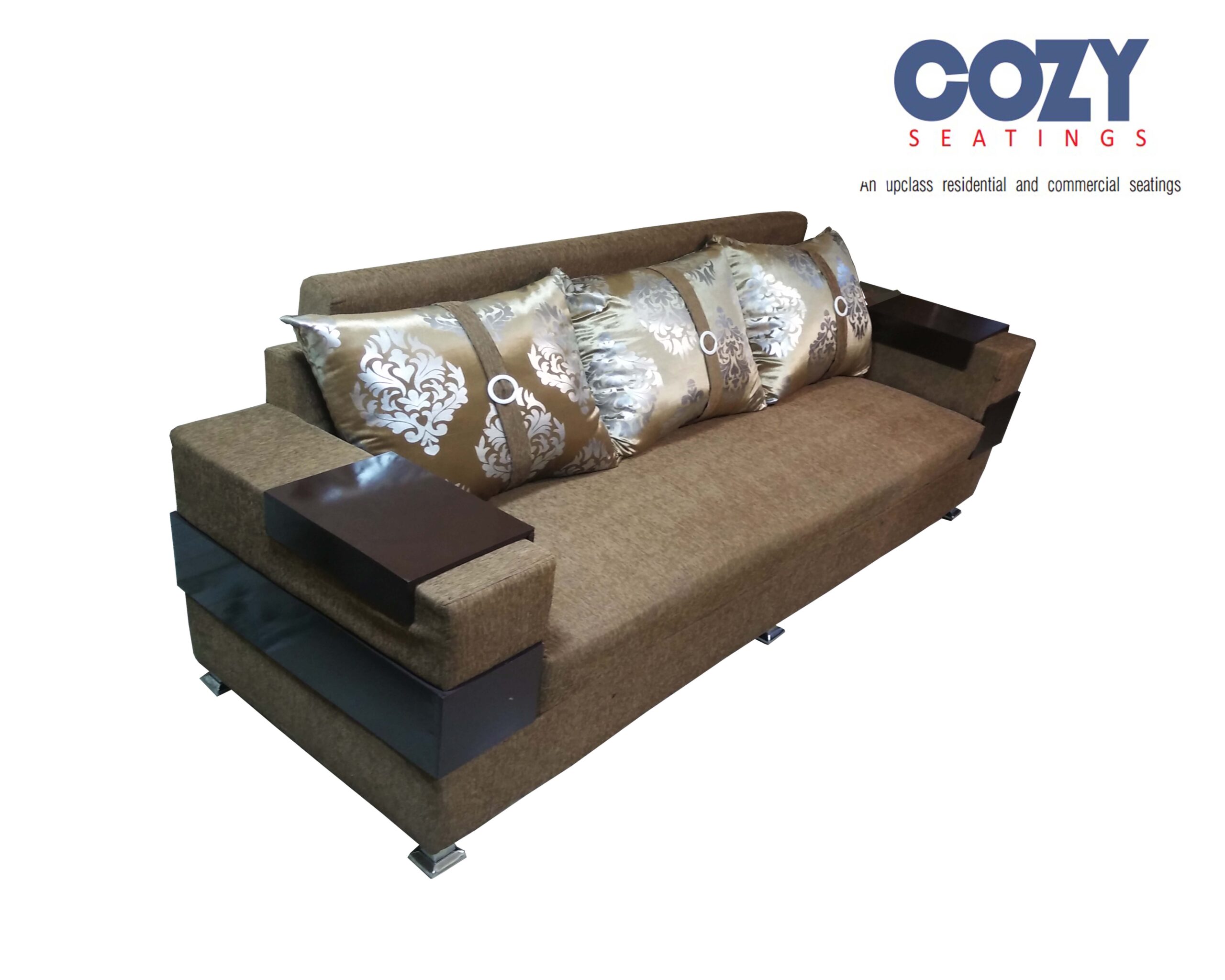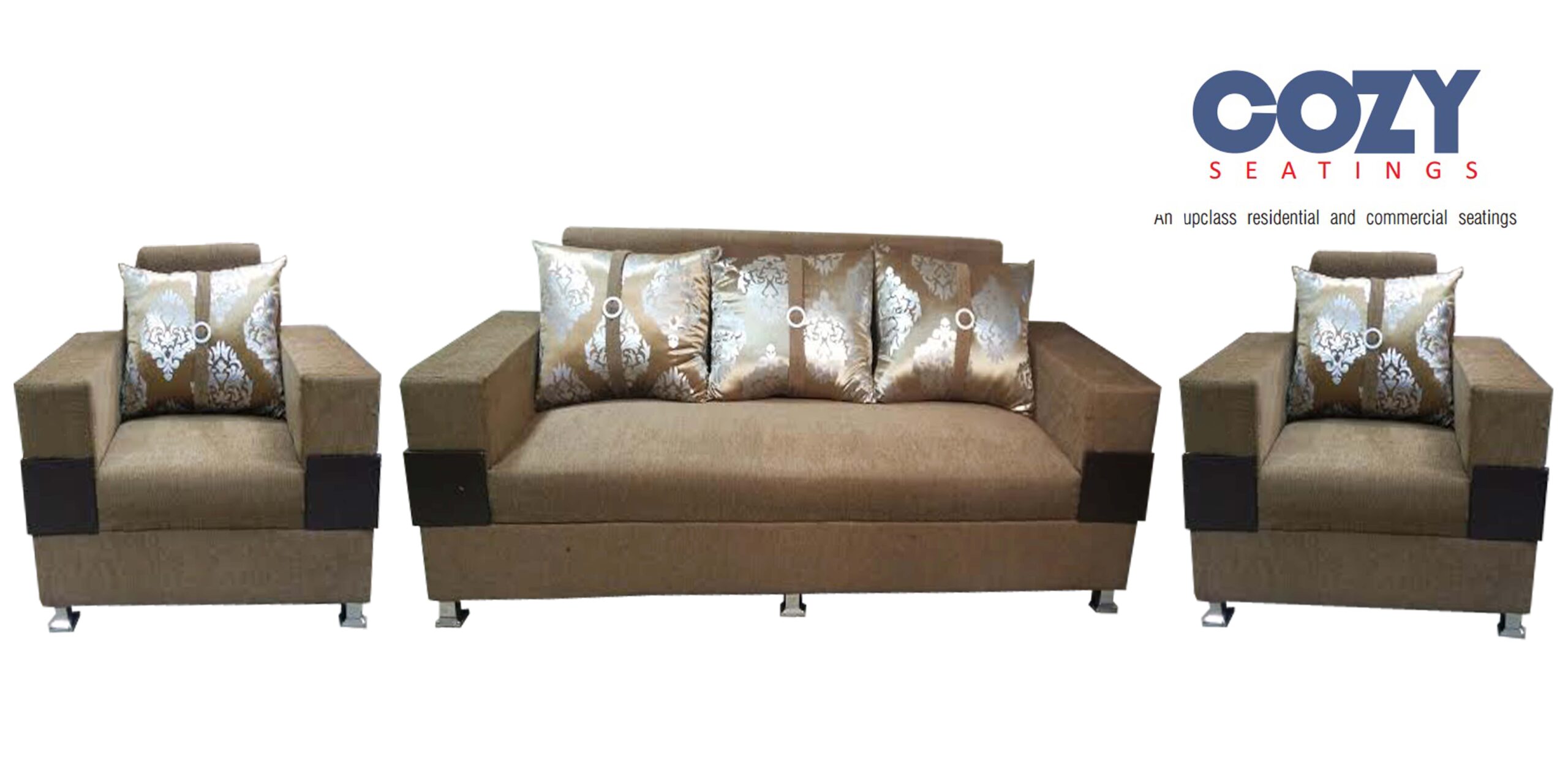 Bring home timeless elegance with this premium 3+1+1 sofa set from Cozy Seatings. Designed with high-quality fabric upholstery in a warm brown tone, this set features one spacious three-seater sofa and two matching single-seater chairs. The beautifully patterned designer cushions add a touch of luxury and enhance the overall aesthetic appeal.